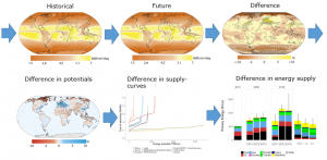 The approach by Gernaat et al. (2021) is schematically shown in Figure 1. They first created climate- and spatially explicit energy supply estimates that are subsequently translated to regional cost-supply curves. The dataset contains the extended data underlying the figures in Gernaat et al., (2021), including geographically-explicit changes in energy supply potentials by energy carrier, as well as cost-supply curves (see list below).